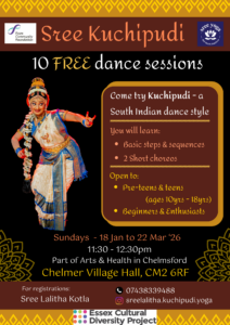 The free workshop is part of Essex Cultural Diversity Project’s Creative Health Programme. The Arts & Health Chelmsford project is funded by Essex Community Foundation, and aims to encourage young people from diverse communities to engage with arts and culture through traditional artforms from the Subcontinent, supporting their mental health and wellbeing.
